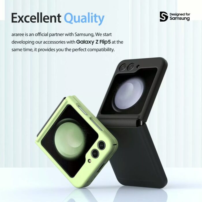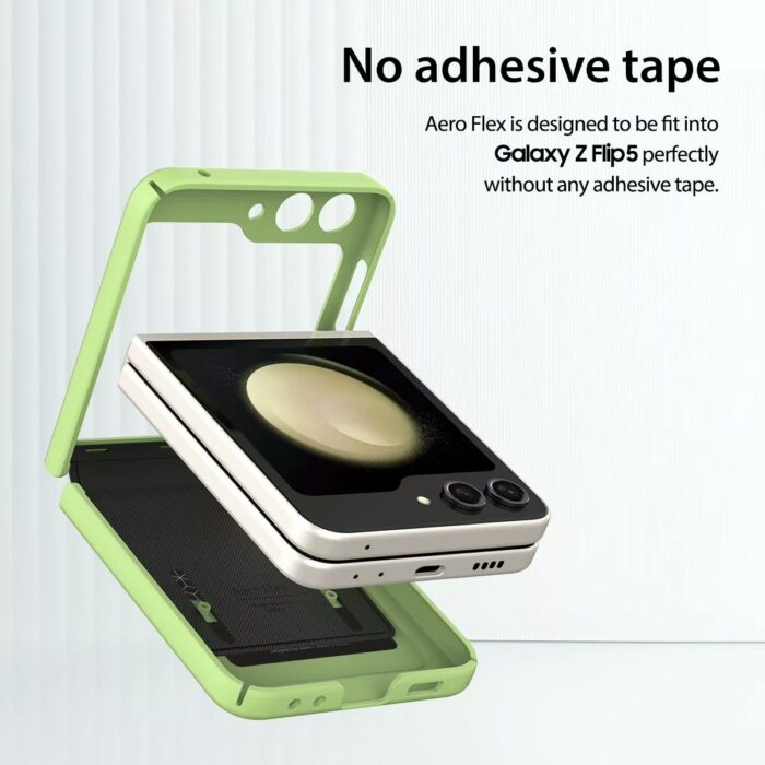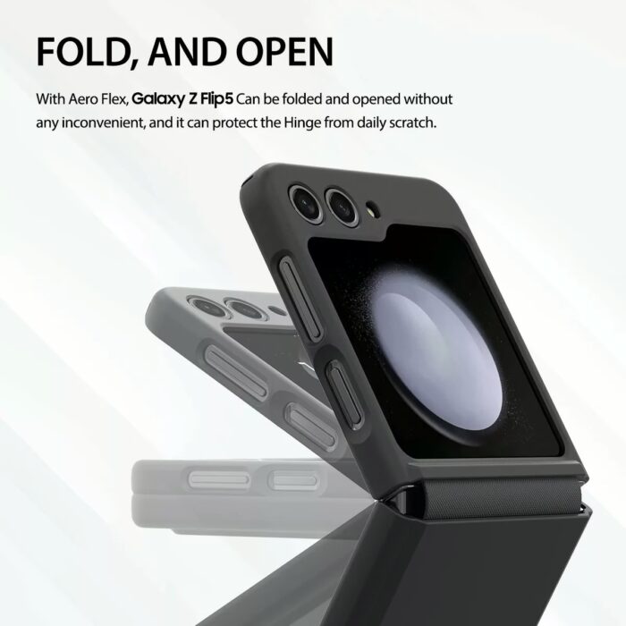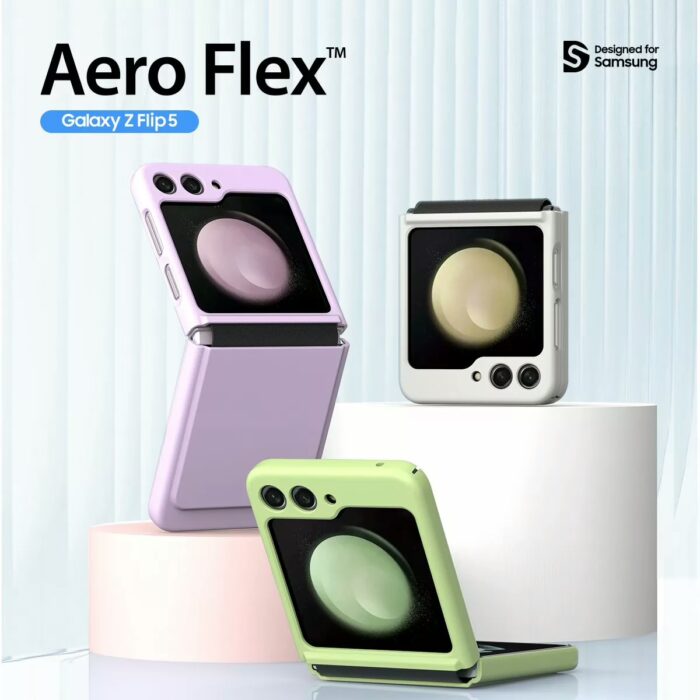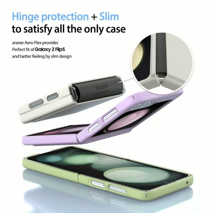 ปกป้อง Galaxy Z Flip5 ด้วยเคสรุ่น AERO FLEX จากแบรนด์ Araree ผลิตจากโพลีคาร์บอเนต พร้อมแผ่นยาง TPU ที่คลุมบริเวณบานพับเครื่อง ปกป้องได้ทั้งตอนพับ-กาง ป้องกันอีกระดับด้วยการยกขอบสูงจากหน้าจอและเลนส์กล้อง ลดการเกิดรอยเมื่อสัมผัสกับพื้นผิวโดยตรง