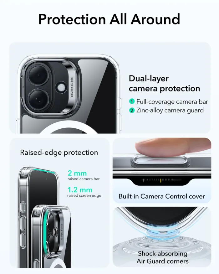 • ผ่านการทดสอบ Military-Grade Drop Protection ถึง 3 เท่า มุมเคสเสริม Air-Guard ซับแรงกระแทกได้มั่นใจแม้ตกหล่นบ่อย