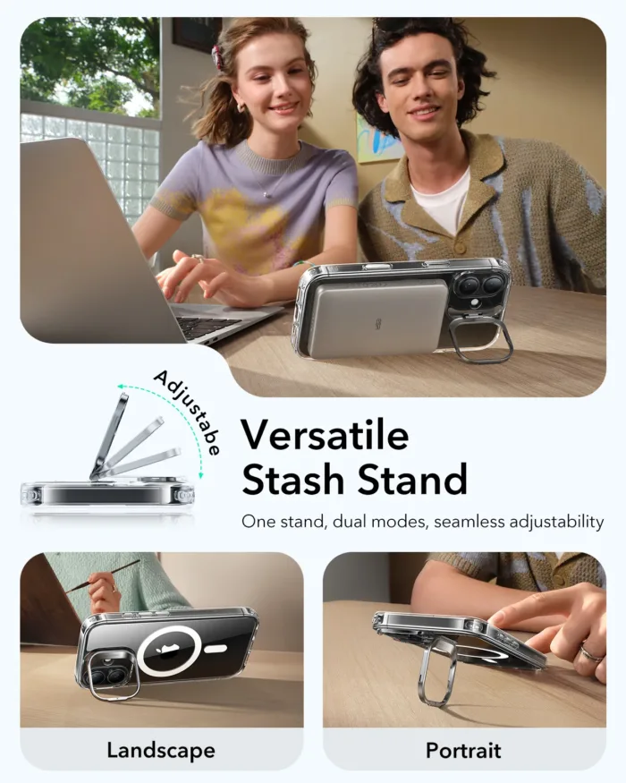 • Stash Stand ซ่อนในตัวเคส กางออกได้ทันที ใช้ตั้งวางแนวนอนดูคลิป เล่นวิดีโอ หรือประชุมออนไลน์ สะดวกโดยไม่ต้องพกขาตั้งเสริม