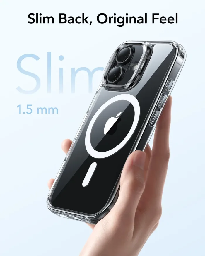 ESR Classic Hybrid with Camera Control เคสใส MagSafe สำหรับ iPhone ที่ออกแบบมาให้ครบทั้งฟังก์ชันและสไตล์ ตัวเคสเป็น Hybrid PC + TPU เคลียร์ใส โชว์ดีไซน์ iPhone ได้เต็มตา แต่มาพร้อมฝาปุ่ม Camera Control Button ที่ทำงานนุ่ม ๆ สั่งถ่ายหรือเปิดแอปกล้องได้ทันใจ เพิ่มฟังก์ชั่น Stash Stand ที่มีขาตั้งเสริมซ่อนไว้ที่กรอบเลนส์ และตัวเคสยังผ่านการทดสอบ การปกป้องระดับ Military-Grade ถึง 3 เท่าเพื่อให้มั่นใจว่าทนจริง พร้อม MagSafe ที่แน่นมากๆ