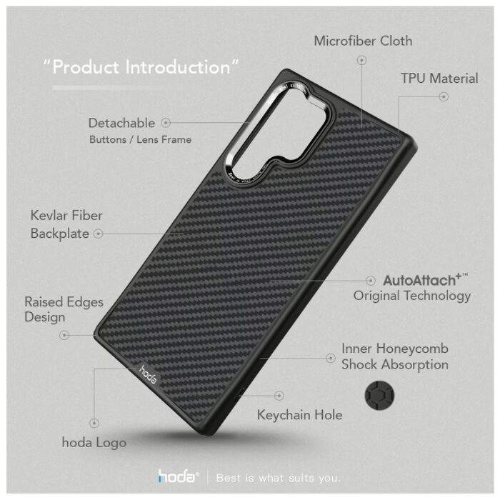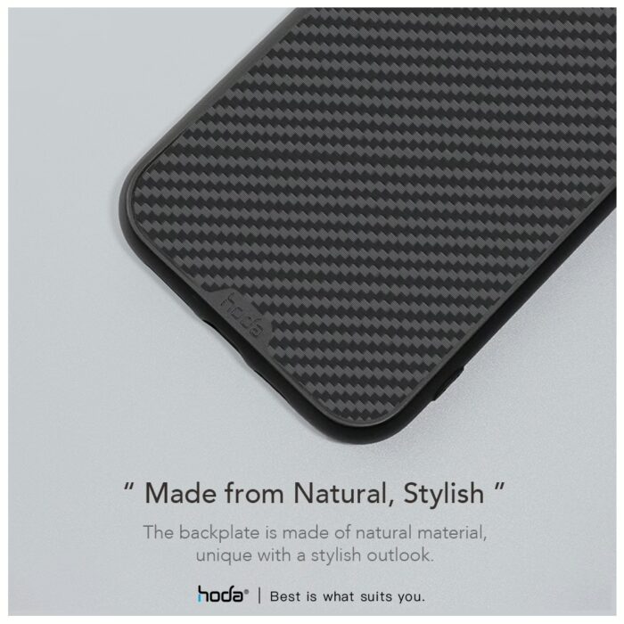 เคส Hoda รุ่น Diverse Case with Magnetic เคสที่ผลิตจากวัสดุธรรมชาติ มีเอกลักษณ์เฉพาะตัว ขอบเคสด้านในดีไซน์แบบรังผึ้ง เพื่อช่วยลดแรงกระแทกจากการตกด้วยการดูดซับแรงกระแทก ด้านในเคสรองด้วยผ้าไมโครไฟเบอร์ เพื่อช่วยป้องกันรอบขีดข่วน ผ่านมาตรฐานการกันกระแทกระดับ MIL-STD-810H บริเวณขอบหน้าจอ เลนส์กล้อง และมุมด้านหลังทั้งสี่มุมยกสูงขึ้น รองรับการใช้งานร่วมกับอุปกรณ์เสริมที่มีแม่เหล็ก Magnetic