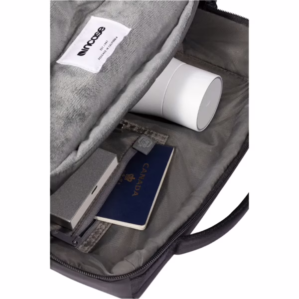 - ช่องใส่แล็ปท็อปด้านในบุขนเทียมและนวมสามารถใส่ MacBook 16″ และ iPad 12.9″ ได้
