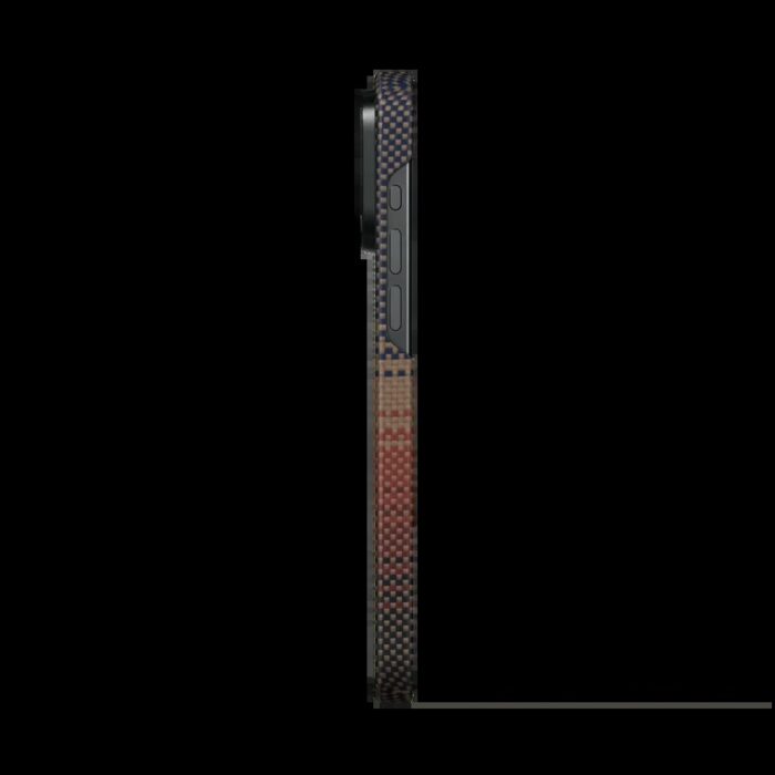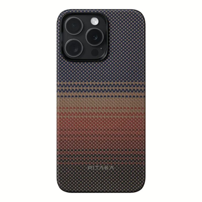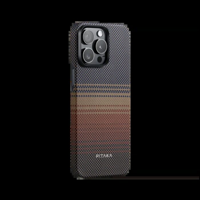 เคส Pitaka รุ่น MagEZ Case 5 ซีรีส์ Weaving+ “Sunset Moment” ผลิตจากเส้นใยอะรามิดระดับพรีเมียม ที่แสดงถึงช่วงเวลาที่น่าดื่มด่ำตั้งแต่พระอาทิตย์ตกถึงพระจันทร์ขึ้น ท้องฟ้าที่เปลี่ยนสีจากโทนอุ่นไปเป็นโทนเย็น แสดงถึงความเงียบสงบ ภายในวงแหวน MagSafe มีเทคโนโลยี Amber Magnet Film™, MagSafe SlimBoard 2.0 ที่ทำให้เคสมีความบางและเบาลงถึง 27% สามารถรองรับการใช้งานกับอุปกรณ์เสริม MagSafe