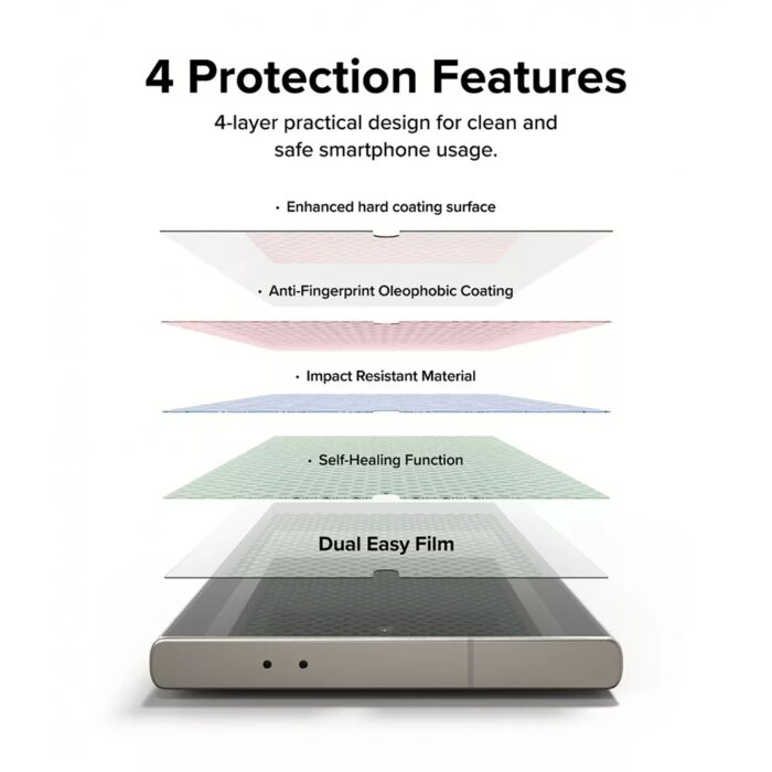 - โครงสร้าง 4 ชั้น เพื่อการปกป้องสูงสุด (ชั้นกาวชั่วคราวที่ช่วยขจัดฝุ่น และสามารถลองติดซ้ำได้หลายครั้งเพื่อให้ได้การจัดตำแหน่งที่สมบูรณ์แบบ)
