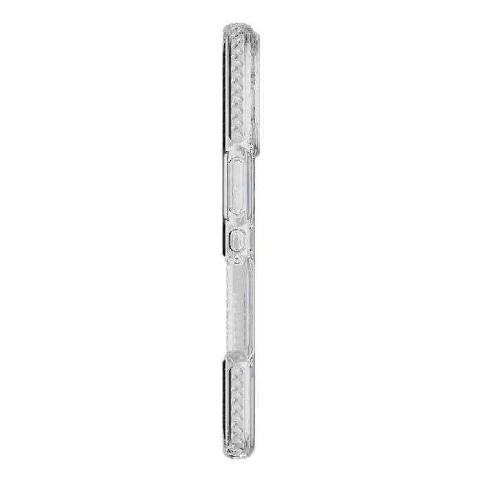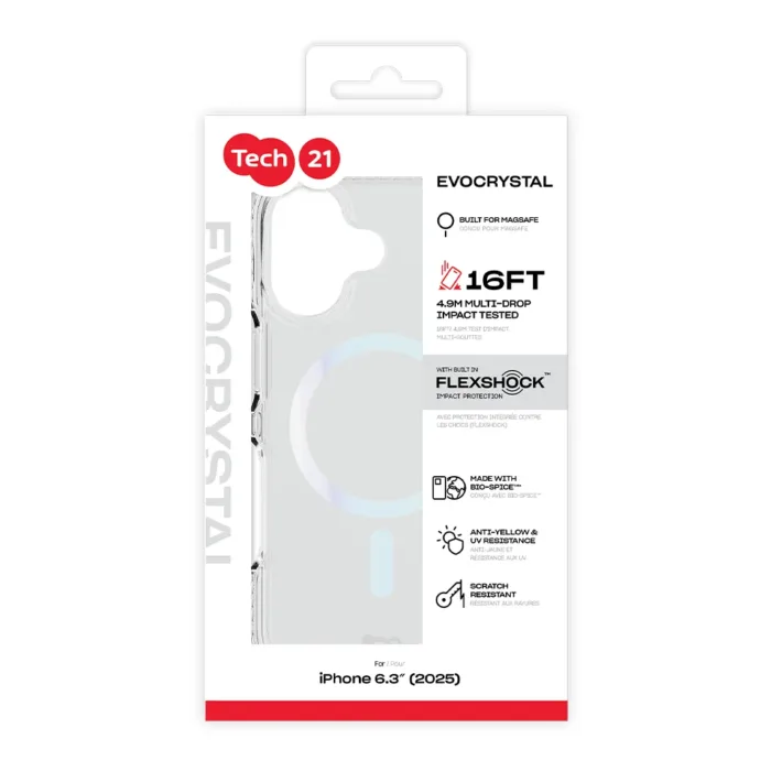 Tech21 Evo Crystal คือเคสใสที่ออกแบบมาเพื่อโชว์ความสวยของสมาร์ตโฟนได้อย่างคมชัดระดับคริสตัล พร้อมมอบการปกป้องเหนือมาตรฐานด้วย FlexShock™ วัสดุดูดซับแรงกระแทกเฉพาะจาก Tech21 ที่ถูกพัฒนาขึ้นให้บาง เบา แต่สามารถดูดซับและสลายแรงกระแทกได้ดีกว่า TPU ทั่วไปหลายเท่า วัสดุหลักผสมผสาน Aliphatic TPU + Polycarbonate ที่ให้ทั้งความใสและความแข็งแรง ป้องกันการเหลืองด้วย UV-resistant และผ่านการทดสอบตกกระแทกหลายครั้งตามมาตรฐาน Tech21 Multi-Drop ตัวเคสบาง กระชับมือ ขอบยกสูงปกป้องกล้องและหน้าจอ พร้อมปุ่มกด Clicky รองรับ MagSafe และการชาร์จไร้สายครบถ้วน