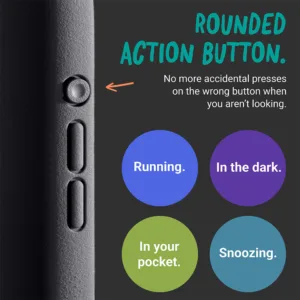 - ปุ่ม Action Button ทรงกลมที่ทำมาแยกกกับรูปทรงของปุ่ม เพิ่ม-ลด เสียงได้ชัดเจน ทำให้ไม่ต้องมองก็กดโดน