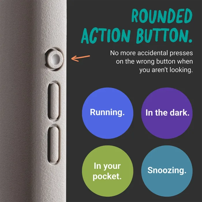 - ปุ่ม Action Button ทรงกลมที่ทำมาแยกกกับรูปทรงของปุ่ม เพิ่ม-ลด เสียงได้ชัดเจน ทำให้ไม่ต้องมองก็กดโดน