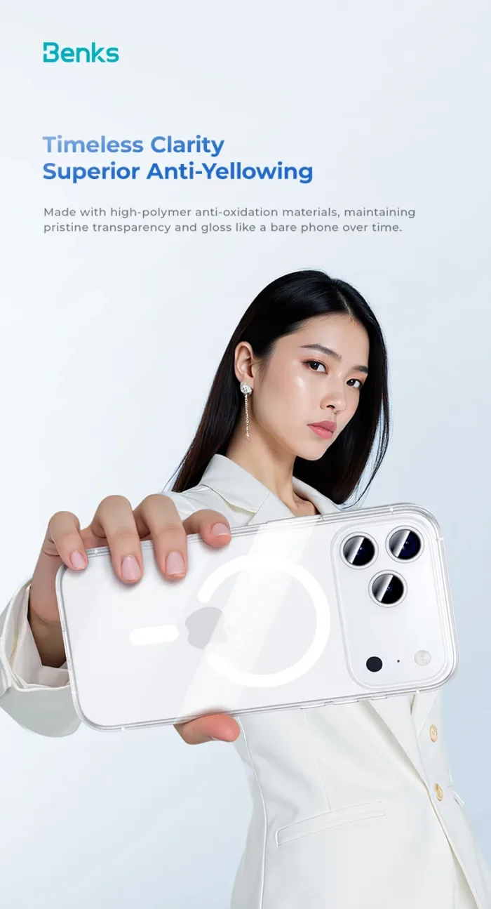 Benks MagClap Crystal with Camera Control เคสใสพรีเมียมที่ออกแบบมาเพื่อโชว์ความสวยของ iPhone แบบเต็ม ๆ แต่ยังปกป้องได้รอบด้าน ตัวเคสใช้โครงสร้าง Hybrid PC + TPU ที่ทั้งแข็งแรงและยืดหยุ่น เสริมแม่เหล็ก MagSafe แรงดูด 7N ให้ใช้งานกับอุปกรณ์เสริมได้มั่นใจ มุมเคสมี Air-Cushion กันกระแทก ขอบกล้องยกสูง ปุ่มโลหะ Clicky ตอบสนองดี มีปุ่ม Camera Control เพิ่มลูกเล่นการใช้งานจริง และยังเคลือบ Slow-to-Yellow ที่ทำให้ใสทนนาน ไม่หมองง่าย