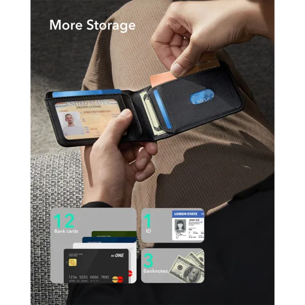 ESR Card Holder Wallet Classic กระเป๋าสตางค์แบบบางพรีเมียม ที่รวมฟังก์ชัน กระเป๋าสตางค์ Everyday Carry กับ ระบบติดตามตำแหน่งผ่าน Apple Find My ในตัว โดยไม่ต้องพก AirTag แยกให้เพิ่ม Bulk ดีไซน์เป็นลายคาร์บอนไฟเบอร์ดูล้ำสมัย พร้อม RFID Blocking Protection เพื่อป้องกันการสแกนข้อมูลบัตรโดยไม่ได้รับอนุญาต เหมาะสำหรับคนที่พกบัตรจำนวนมากและต้องการความสบายใจในเรื่องการติดตาม/ป้องกันข้อมูลส่วนบุคคล