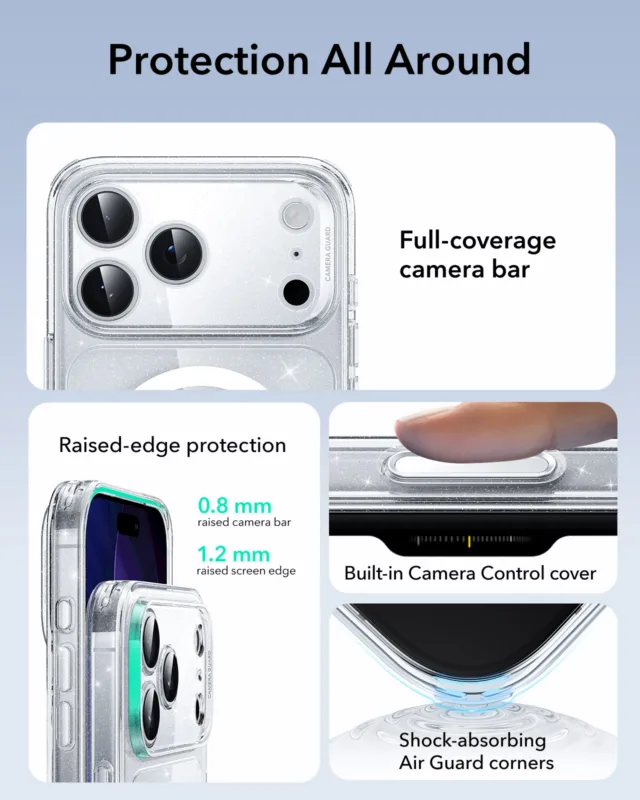 - ขอบหน้าจอยกสูง 0.8 มม. และขอบกล้องยกสูง 1.8 มม. ปกป้องรอบด้าน ลดความเสี่ยงจากรอยเมื่อวางคว่ำหรือหงาย
