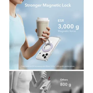• Dual-side magnetic designและแม่เหล็กคุณภาพ N52 จำนวนมาก โดยมีแม่เหล็ก 2 ด้าน พร้อมโครงแม่เหล็ก 3 ชั้น ช่วยให้แรงยึดจับสูง เมื่อใช้คู่กับเคส MagSafe ดึงแรงได้สูงสุดถึง 3,000 g