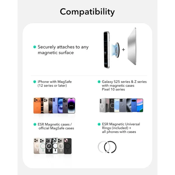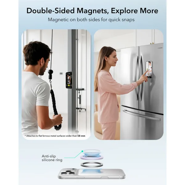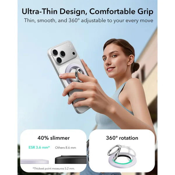 ESR Dual-Side Magnetic Phone Grip Stand 360 คือแหวนแม่เหล็ก MagSafe ที่ทั้งเป็น ที่จับ ให้ถือมือถือมั่นคง และ ขาตั้งหรือจะเป็น holder ก็ได้ เป็นอุปกรณ์สำหรับตั้งดูวิดีโอ  ตัว Grip Stand บางมาก ที่บางกว่ารุ่นทั่วไปประมาณ 40% พร้อมแม่เหล็กแรงสูง ยึดติดแน่นกับเคส MagSafe ทำให้เหมาะทั้งสำหรับคนที่ใช้งานมือถือไม่ว่าจะเป๋น ถ่ายรูป ดูหนัง หรือพกใช้งานทั่วไปก็เป็นอีกตัวช่วยที่ทำให้การใช้งานอุปกรณ์ได้ง่ายขึ้น