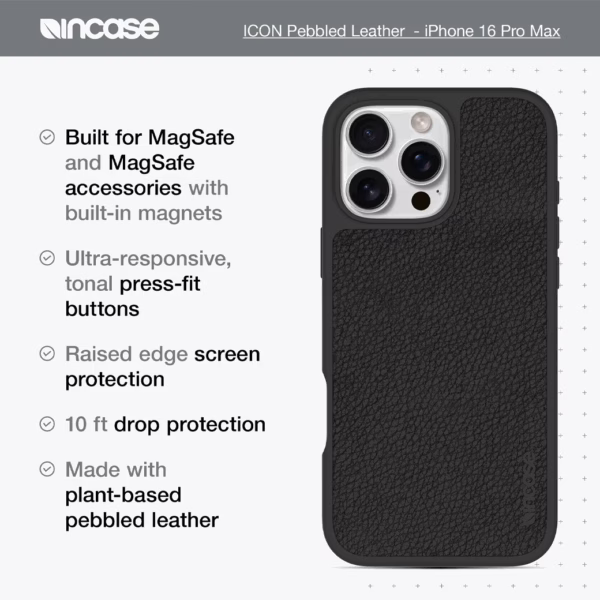 Incase รุ่น Icon Case for Magsafe – เคส iPhone 16 Pro Max – สี Obsidian Pebbled Plant Leather