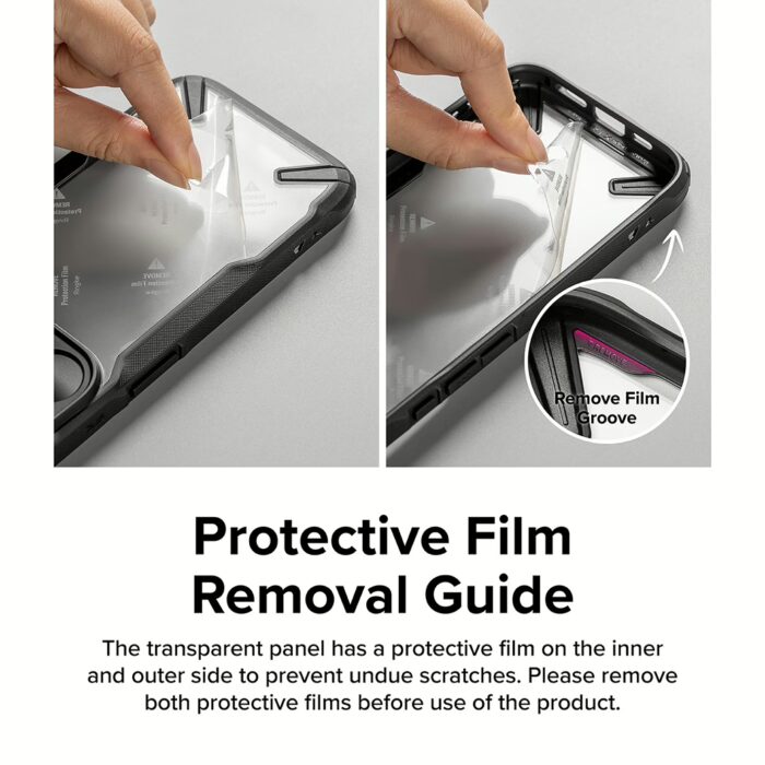 • ข้อแนะนำ: มีแผ่นฟิล์มใสอยู่ด้านในและด้านนอกของเคส ควรลอกแผ่นฟิล์มออกก่อนใส่เครื่องเข้าไปเพื่อใช้งาน