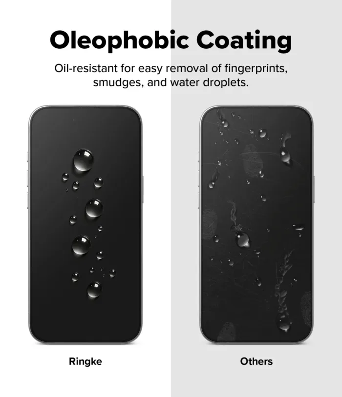- เคลือบสาร Oleophobic แบบพิเศษ ช่วยให้ทนทานต่อน้ำมัน จึงสามารถเช็ดรอยนิ้วมือ รอยเปื้อน และหยดน้ำได้ง่าย