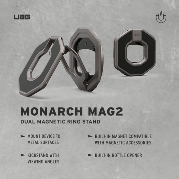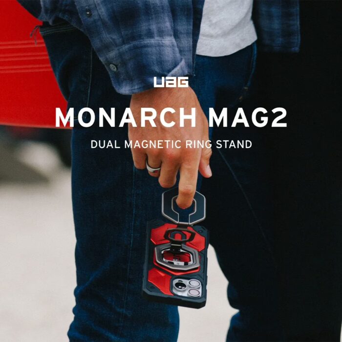 - ข้อควรระวัง: กรณีที่ลูกค้าใช้งานขาตั้งวงแหวนแม่เหล็ก UAG รุ่น Monarch Mag2 Ring Stand ร่วมกับเคสที่มี Magsafe/Magnetic อาจทำให้เคสเกิดรอยบริเวณวงแม่เหล็กได้ เนื่องจากการเสียดสีของวง MagSafe ที่เป็นโลหะ ซึ่งสามารถเกิดขึ้นได้ตามปกติจากการใช้งาน และไม่ส่งผลต่อการใช้งานสินค้า (กรณีการเกิดรอยดังกล่าวจึงไม่อยู่ในเงื่อนไขการรับประกันสินค้า)
