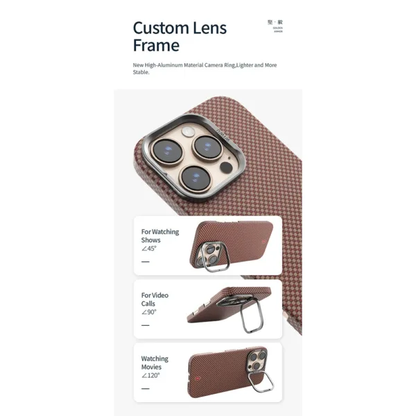WiWU Aramid Armor เป็นเคสที่ผสานวัสดุ Aramid Fiber 600D ที่ทนต่อการเสียดสีและแรงกระแทกเข้ากับ มี MagSafe เพื่อใช้งานร่วมกับอุปกรณ์อื่นๆได้ พร้อมระบบ Kickstand ขาตั้งบริเวณกันเลนส์กล้อง ให้คุณดูหนัง เล่นเกม หรือประชุมออนไลน์ได้สะดวกโดยไม่ต้องพึ่งอุปกรณ์เสริมอื่นๆ ช่วยให้การใช้งานจริงทั้งวันทั้งงานและความบันเทิงเป็นไปอย่างลื่นไหล