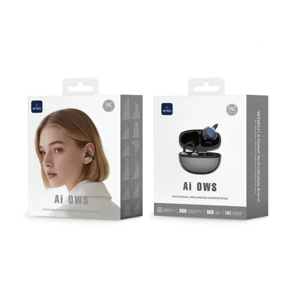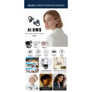 WiWU Ai306 เป็นหูฟัง Multilingual Real-Time Translation Wireless Earbuds ที่รวมเสียงคมชัดและฟีเจอร์แปลภาษาแบบสดผ่านแอปเข้าด้วยกัน พร้อมดีไซน์ Clip-On ที่ให้ความสบายกับหู ไม่อุดหู ทำให้เวลาใช้งานจริงไม่ปิดกั้นเสียงรอบข้างและยังสื่อสารได้คล่องแม้จะอยู่ในสภาพแวดล้อมที่มีเสียงฝูงชน